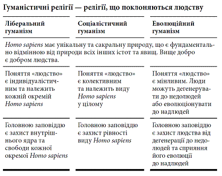 Теїстичні релігії зосереджені на поклонінні богам. Гуманістичні ж релігії поклоняються людству, або, точніше буде сказати, Homo sapiens. Гуманізм – це віра в те, що Homo sapiens має унікальну та сакральну природу, яка фундаментально відрізняється від природи всіх інших тварин та всіх інших явищ. Гуманісти вірять, що унікальна природа Homo sapiens є найважливішою річчю у світі й визначає все, що відбувається у всесвіті. Вище добро є добром Homo sapiens. Решта світу та решта істот існують виключно на користь цього виду.