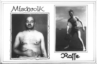 30. Плакат нацистської пропаганди, де праворуч демонструється «расово чистий арієць», а ліворуч – «метис». Очевидним є захоплення нацистів людським тілом, як і їхній страх, що нижчі раси можуть забруднити людство та спричинити його дегенерацію