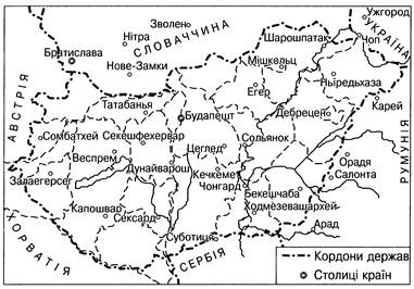 Згідно з мирним договором, підписаним країнами-переможницями та Угорщиною в Парижі (лютий 1947), були відновлені колишні «тріанонські» кордони, до яких були внесені незначні корективи. Так Чехословаччині передавалися 43 кв. км з трьома угорськими селами, а кордон навпроти словацької столиці переміщувався на правий берег Дунаю. У договорі обминалося питання стосовно захисту прав угорської нацменшини. Сума репарацій, яку повинна була сплатити Угорщина, становила 300 млн доларів. У вересні 1947 р. в Угорщині припиняла діяльність СКК, що означало відновлення її державного суверенітету. Згідно з договором у 90-денний термін з країни мали бути виведені радянські окупаційні війська. Допускалася лише присутність військових підрозділів, які забезпечували шляхи сполучень із радянською зоною окупації в Австрії. Однак радянські підрозділи не були виведені з території Угорщини не тільки у зазначений термін, але й залишилися тут на досить тривалий період1.