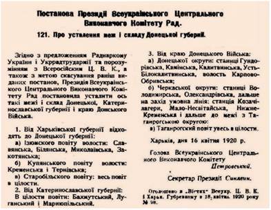 Для відбудови економіки і, зокрема, з метою якнайшвидшого вирішення паливної проблеми, на початку 1920 р. увесь Донбас Кремль вирішив об’єднати у межах однієї губернії. Для цього були значно розширені межі вперше утвореної ще на початку 1919 р. (тоді — у складі Бахмутського та Слов’яносербського (Луганського) повітів як тимчасова адміністративна одиниця) Донецької губернії. Тепер до її складу було долучено і ту частину Донбасу, що до революції була складовою Області Війська Донського, а також, з метою кращого забезпечення продовольством, приєднано низку сільськогосподарських регіонів. Оскільки більша частина Донбасу, який в межах дореволюційної Катеринославської губернії охоплював Слов’яносербський (Луганський) та Бахмутський повіти, входила до складу УСРР і була переважно українською за етнічним складом населення, то новостворена губернія стала складовою частиною радянської України. Це рішення було легалізоване узгодженою з Кремлем постановою ВУЦВК від 16 квітня 1920 р. (див. рис. 9)