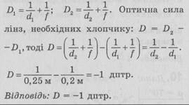Тому йому необхідні окуляри з розсіювальними лінзами (їх оптична сила — від’ємна). Визначимо оптичну силу ока для першого (d1 = 0,2 м) і другого (d2 = 0,25 м) випадків.