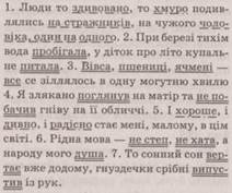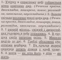 1. Була весна весела, щедра, мила, промінням грала, сипала квітки, вона летіла прудко, мов стокрила, за нею вслід — співучії пташки. 2. На самому дні яру, біля криниці з великим журавлем, обсаджена навкруги садком, стояла хата Марка Чумаченка, батька Мотриного... 3. Найдорожча пісня недоспівана, а найліпша та, що не знайду. 4. Почекавши трохи, я зліз із воза, розплатився з дядьками і, взявши свого чемоданчика, пішов до ганку. 5. Сповідуюсь. Перед Всесущим Богом та материнським поглядом простим, який в далеку проводжав дорогу і вслід мене не раз перехрестив.