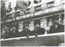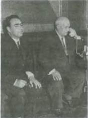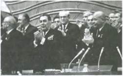 На святкуванні 50-річчя радянської України. У центрі (зліва направо): В. Щербицький, Л. Брежнєв, П. Шелест. Київ, грудень 1967 р.