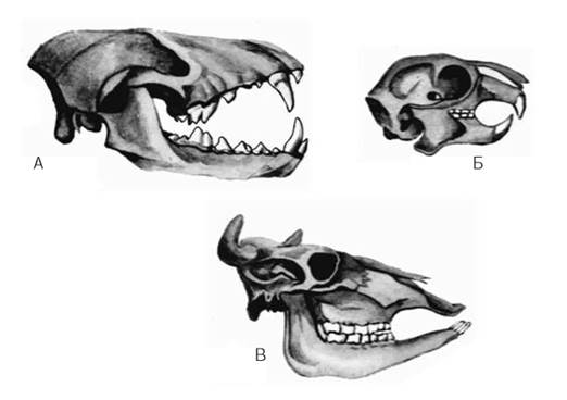 3. Роздивіться зуби вовка (А), миші (Б) та корови (В). Зверніть увагу на розвиток окремих груп зубів у різних ссавців. У миші краще розвинені різці, у вовка — ікла, а в корови — жуйні зуби.