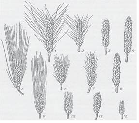 Гомологічні ряди спадкової мінливості за остюками: 1-4 - м'яка пшениця; 5-8 - тверда пшениця; 9-12 - шестирядний ячмінь.