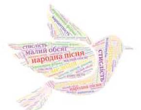 • Скориставшись хмарою слів, назви основні особливості народних пісень і запиши їх у зошит. Дві-три ознаки прокоментуй. Поміркуй, чому слова відтворено на зображенні пташки.