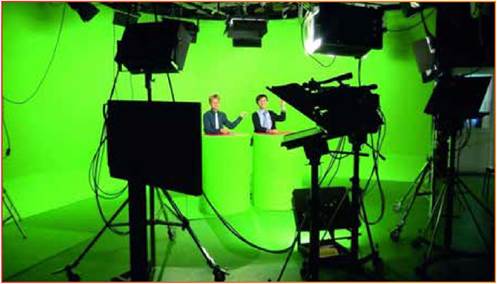 Згадайте, що вам відомо про хромакей. Перегляньте світлину і розкажіть у чому особливості зйомок з використанням хромакею.
