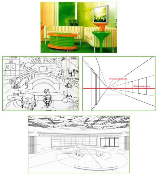 Спробуйте власні сили у ролі дизайнера/дизайнерки на телебаченні. Намалюйте інтер’єр шкільної телестудії. Як вона повинна виглядати, щоб буди бути цікавою та сучасною? Під час малювання інтер’єру, не забувайте про перспективу (лінію горизонту та точки сходу).