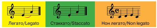 Під час співу на легато — голосні звуки проспівуються довго, а приголосні вимовляються коротко. Перехід з одного звуку на інший повинен бути плавним, рівним, непомітним, але точним. Спів на cтаккато — це прийом ведення звуку, під час якого звучання звуку коротке, з невеликими поштовхами-акцентами на складах, звуки не зв’язуються між собою. Спів нон легате об’єднує в собі манеру виконання і легато, і стаккато. При виконанні цього прийому звуки розподіляються, не зв’язуються між собою і відбувається підкреслення складів.