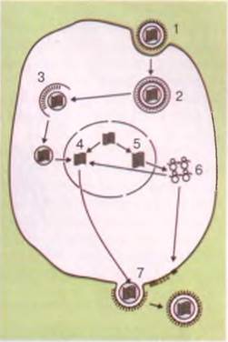 Рис. 32.2. Жизненный цикл вируса гриппа: 1 - прикрепление вируса к чувствительной клетке; 2 - образование эндосомы (пузырька) с вирусом; 3 - слияние мембран и попадание РНК вируса в цитоплазму; 4 - проникновение РНК вируса в ядро клетки; 5 - транскрипция и репликация вирусной РНК; 6 - синтез вирусных структурных белков и сборка вирионов; 7 - «выход» вирионов из клетки