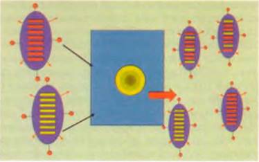 Вирус гриппа передается воздушно-капельным путем, поражая слизистые оболочки верхних дыхательных путей. Прикрепляясь с помощью рецепторных молекул (найдите их на рисунке 32.1) к клеткам эпителия, вирусная РНК проникает через цитоплазму в ядро клетки. В ней происходит самосборка вирусных частиц, сопровождаемая разрушением клеточных структур и выходом вирионов в межклеточное пространство (рис. 32.2). Когда в эпителиальной ткани накапливается много разрушенных клеток, развиваются симптомы инфекции: кашель, повышение температуры. Вирусные частицы во время кашля со слюной больного попадают на слизистые оболочки здоровых людей. Так может начаться эпидемия гриппа. Чаще всего это происходит осенью и зимой (подумайте,, почему).