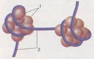 Мал. 14.1. Структура нуклеосоми: 1 - глобулярні білки; 2 - нитка ДНК