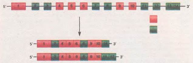 Мал. 14.2. Альтернативний сплайсинг: вгорі - молекула незрілої іРНК, яка кодує білок a-тропоміозин: червоним кольором показано екзони, які обов’язково залишаються у зрілій молекулі іРНК (1, 4-6, 9, 10), зеленим (2, 3, 7, 8, 11-14) - необов’язково. Зверніть увагу: залежно від того, які саме необов’язкові екзони залишаються після альтернативного сплайсингу, утворюються різні молекули іРНК: верхня кодує білок, що входить до складу непосмугованих м’язових клітин, нижня - посмугованих