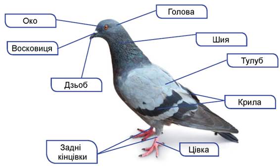 Мал. 55.1. Зовнішня будова птаха на прикладі голуба