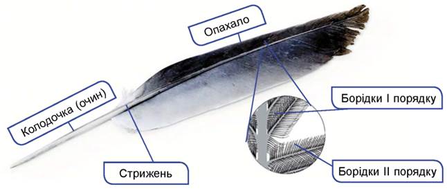 Окремі пера складаються зі стрижня, від якого в обидва боки відходять численні тоненькі вирости — борідки (мал. 55.3).