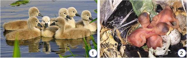 Мал. 55.5. Типи пташенят: 1 — виводкові лебедя-шипуна; 2 — нагніздні горобця хатнього