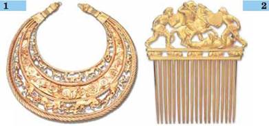 • Рассмотрите пектораль - украшение скифского царя. Это высокохудожественное произведение 4 в. до н. э. было найдено в скифском кургане Толстая Могила на Днепропетровщине. Сделано украшение из золота, вес его 1150 г. Второй памятник - золотой гребень из кургана Солоха на Днепропетровщине.
