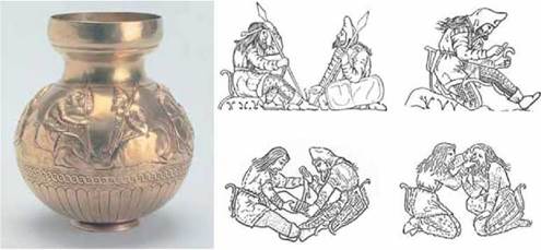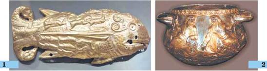 2. Чаша из кургана Гайманова Могила на Запорожье. На памятнике изображены знатные скифы и скифы, которые им прислуживают. Вельможи ведут между собой беседу, бойко жестикулируя. Они одеты в кафтаны, узкие штаны, мягкие кожаные ботинки.