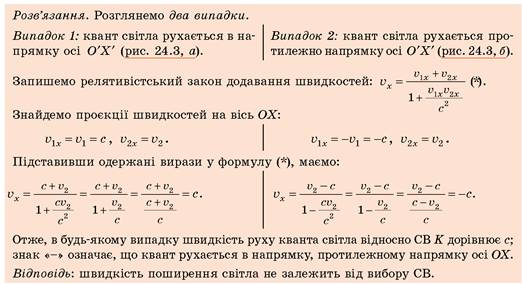 Відповідно до другого постулату СТВ швидкість поширення світла у вакуумі є незмінною й не залежить від швидкості руху джерела або приймача світла. Це означає, що класичний закон додавання швидкостей у релятивістській механіці застосовувати не можна. У СТВ застосовують релятивістський закон додавання швидкостей. Запишемо цей закон для окремого випадку, — випадку додавання швидкостей, напрямлених уздовж однієї прямої, наприклад осі ОХ (рис. 24.3). Тоді релятивістський закон додавання швидкостей має вигляд: