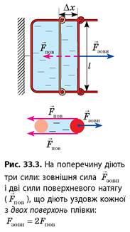 Опустимо в мильний розчин дротяну рамку, одна зі сторін якої рухома. На рамці утвориться мильна плівка (рис. 33.3). Будемо розтягувати цю плівку, діючи на поперечину (рухому сторону рамки) з певною силою Fзовн. Якщо під дією цієї сили поперечина переміститься на Δх, то зовнішні сили виконають роботу:
