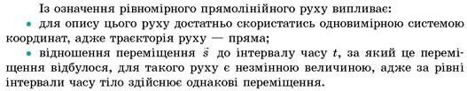• Рівномірний прямолінійний рух — це механічний рух, під час якого тіло за будь-які рівні інтервали часу здійснює однакові переміщення.