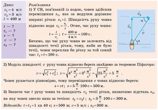 Задача. Рибалка перепливає річку на човні, утримуючи його перпендикулярно до напрямку течії. Швидкість v1 руху човна відносно води — 4 м/с, швидкість ν2течії річки — 3 м/с, ширина l річки — 400 м. Визначте: 1) за який час t човен перепливе річку та за який час t1 човен переплив би річку, якби не було течії; 2) модуль переміщення s і модуль швидкості v руху човна відносно берега; 3) на якій відстані s2 униз за течією від вихідної точки човен досягне протилежного берега.