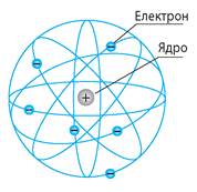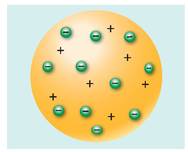 Саме Дж. Томсон у 1903 р. запропонував одну з перших моделей будови атома. Він припустив, що атом має форму кулі, по всьому об’єму якої рівномірно розподілений позитивний заряд, а негативно заряджені електрони вкраплені в кулю (рис. 36.1); сумарний заряд електронів дорівнює заряду кулі, тому атом є електрично нейтральним.