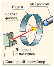 Для дослідів учені використали α-радіоактивну речовину, яку розташували у свинцевому контейнері з вузьким отвором. Пучок α-частинок із контейнера спрямовувався на тонку золоту фольгу, а далі потрапляв в екран, покритий шаром кристалів цинк сульфіду (рис. 36.2). Якщо в такий екран влучала α-частинка, то в місці її влучання відбувався слабкий спалах світла. Учені спостерігали спалахи за допомогою мікроскопа та реєстрували місця влучання α-частинок в екран.