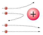 Якщо ж позитивний заряд і маса зосереджені всередині атома — у невеликому порівняно з атомом об’єкті, — то, зіштовхнувшись із ним, позитивно заряджена α-частинка може відскочити назад, а ті α-частинки, які пролітають близько до цього об’єкта, можуть відхилитися внаслідок електричного відштовхування.