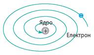 Рис. 36.4. Планетарна модель будови атома, запропонована Е. Резерфордом. Учений також розрахував розмір ядра: воно виявилося дуже малим — порядку 10-15 м, що в 100 000 разів менше, ніж розмір атома (10-10 м).
