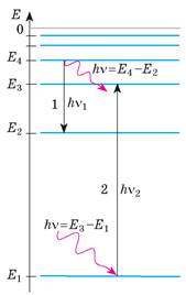 де hν — енергія кванта; Ek — енергія початкового стану атома; Еm — енергія стану, в який перейшов атом.