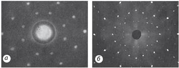 Рис. 36.7. Дифракція нейтронів (а) і рентгенівських променів (б) на монокристалі NaCI, який виконує функцію дифракційної ґратки