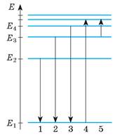 1. На схемі енергетичних рівнів деякого атома (рис. 1) подано переходи цього атома з одного енергетичного стану в інший. Під час яких переходів атом випромінює фотон? поглинає фотон?