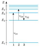 4. На схемі енергетичних рівнів деякого атома (рис. 2) подано переходи цього атома з одного енергетичного стану в інший. Визначте, фотон якої енергії поглине атом, якщо перейде: а) зі стану Е1, у стан Е2; б) зі стану Е1 у стан Е4. Відомо, що ν13 = 6 • 1014 Гц, ν24 = 4 • 1014 Гц, ν32 = 3 • 1014 Гц.