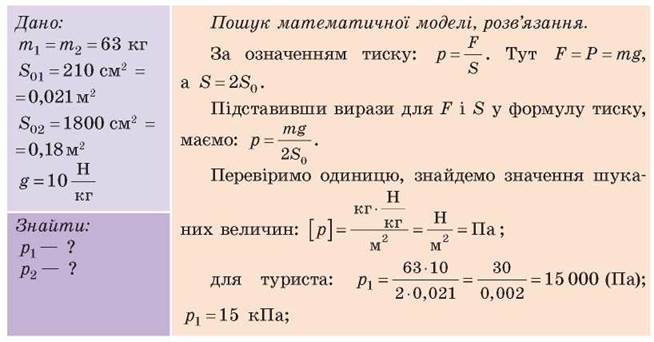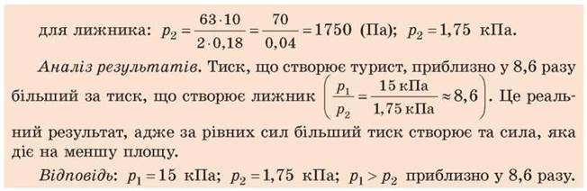 Задача. Порівняйте тиски, які чинять на поверхню снігу юний турист і юний лижник. Маса кожного хлопця разом зі спорядженням становить 63 кг. Площа підошви черевика туриста дорівнює приблизно 210 см2, площа лижі — приблизно 1800 см2.