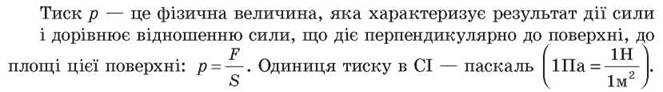 Тиск — це фізична величина, яка характеризує результат дії сили і дорівнює відношенню сили, яка діє перпендикулярно до поверхні, до площі цієї поверхні: