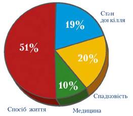 Рівень здоров’я залежить від багатьох чинників і обставин (мал. 3). Деякі з них ми не здатні контролювати (наприклад, спадковість чи стан довкілля). Однак доведено, що здоров’я насамперед залежить від поведінки людини, тобто її способу життя.
