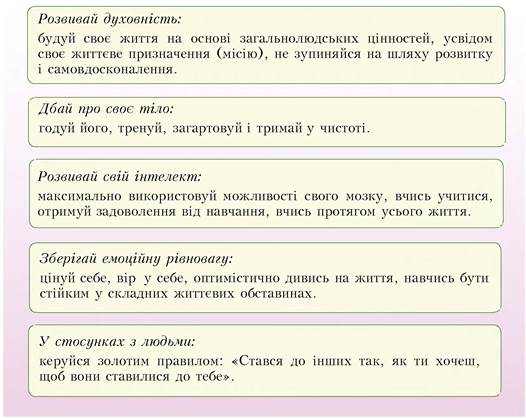 На уроках здоров’я ти маєш унікальний шанс — налаштувати своє майбутнє на успіх. Адже в наш час недостатньо бути лише хорошим фахівцем. Треба набути багатьох умінь і навичок: продемонструвати гідність і самоконтроль, високі моральні якості, здатність долати труднощі, уміння спілкуватися, мотивувати і переконувати, працювати в команді й досягати успіху.