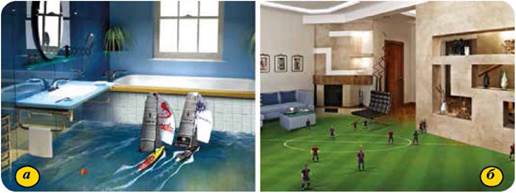 5. Використовуй знайомі образи та сильні асоціації. Згадати кількість днів у місяцях допомагають кісточки пальців. У вивченні іноземних слів найкраще допомагають асоціації. Наприклад, слово «підлога» англійською звучить як «фло» (floor). Щоб запам’ятати це, підшукай українське слово з подібним звучанням, приміром «флот». Відтак уяви, що у ванній кімнаті на підлозі утворилася калюжа, в якій плаває ціла флотилія малесеньких корабликів (мал. 40, а). Те ж саме слово німецькою звучить як «фусбоден» (Fuβboden). Воно подібне за звучанням до слова «футбол». Ти можеш уявити, як крихітні футболісти грають у футбол на підлозі (мал. 40, б). Коли треба буде пригадати, як англійською чи німецькою сказати «підлога», ти мимоволі згадаєш ці картинки і слова. Що несподіванішою і кумеднішою є асоціація, то краще запам’ятаєш це слово.