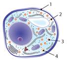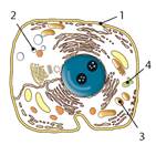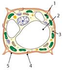 Іл. 41. Ознаки рослинної клітини: 1 - пластиди; 2 - велика вакуоля; 3 - зерна крохмалю; 4 - плазмодесми; 5 - клітинна стінка з целюлози