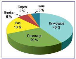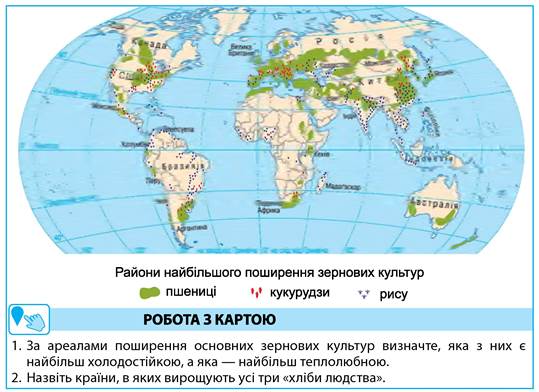 ЗЕРНОВІ КУЛЬТУРИ. Вирощування зернових культур (зернове господарство) — основа рослинництва і всього сільського господарства. Зернові культури зазвичай переважають в аграрних регіонах. Світове виробництво зерна останнім часом становило більше ніж 2,5 млрд тонн на рік. Понад 4/5 з них припадає на три основні «хліби людства» — кукурудзу, пшеницю і рис (мал. 34).