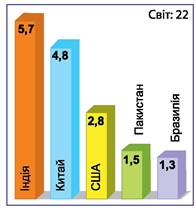 Мал. 40. Лідери з виробництва бавовнику, млн тонн (2015 р.)