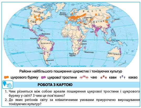 ТЕХНІЧНІ КУЛЬТУРИ. Технічними називають сільськогосподарські рослини (див. мал. 33 на с. 65), які здебільшого використовують як сировину для промисловості (харчової, текстильної, миловарної, лакофарбової, фармацевтичної тощо). Головними цукристими рослинами світу є цукрова тростина і цукровий буряк (мал. 42). Із цукрової тростини щорічно отримують понад 3/4 виготовленого у світі цукру. Цукрова тростина поширена в тропічних широтах, найбільшими її виробниками є Бразилія, Індія та Китай (мал. 38). Цукровий буряк — одна з головних технічних культур помірного й частково субтропічного поясів Північної півкулі. До «п’ятірки» світових лідерів з вирощування солодких коренеплодів входить й Україна (мал. 39).