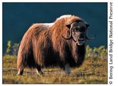 Рис. 2. Овцебык — довольно крупное травоядное копытное животное крепкого телосложения: длина тела — 180—245 см, высота — 110—145 см, вес — 200—300 кг. Это реликт ледникового периода. Густая и длинная шерсть хорошо защищает животное от холода. Находится под охраной.