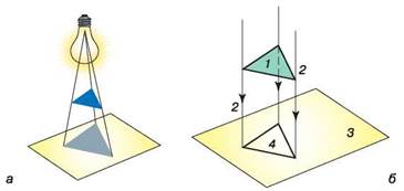 Утворення зображення за допомогою методу проеціювання нагадує утворення тіні від предмета (мал. 31, а). Якщо лампу віддалити, то можна говорити про те, що контур предмета та контури тіні будуть однаковими за розмірами.