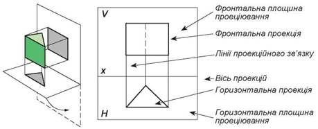 Проеціювання виконують на дві площини проекцій під прямим кутом: горизонтальну та фронтальну (мал. 35). Площини проеціювання позначають великими латинськими літерами: горизонтальну - Н, фронтальну - V. Лінія перетину площин проеціювання називається віссю проекцій. Між фронтальною та горизонтальною площинами проеціювання знаходиться вісь х.