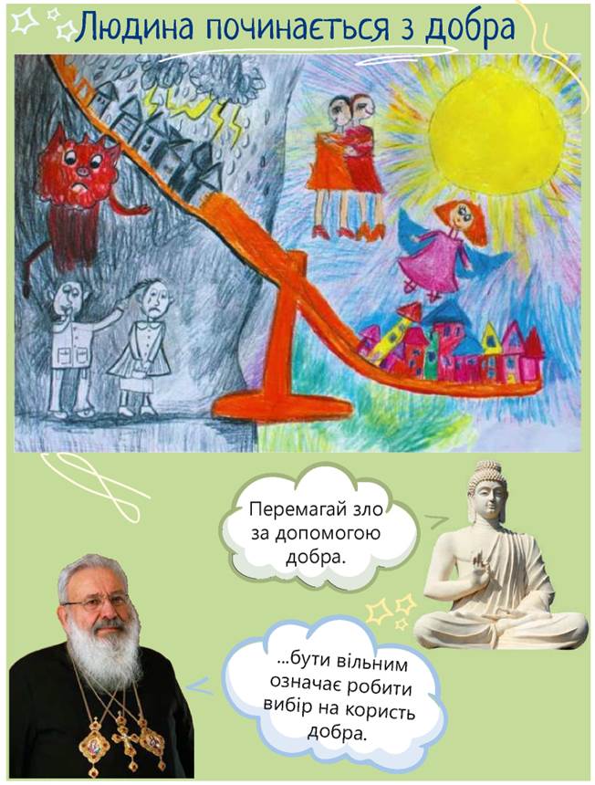 9. Розглянь інформаційний плакат на с. 26. Його основою став малюнок «Добро і зло» Дарини Парахоняк (6 років) із міста Галич Івано-Франківської області.
