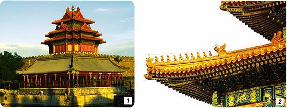 Палац Гугун. Заборонене місто: 1 - екстер’єр; 2 - фрагмент оздоблення даху