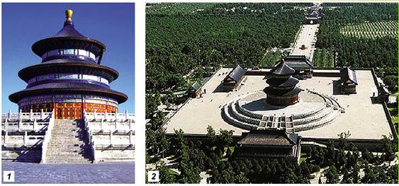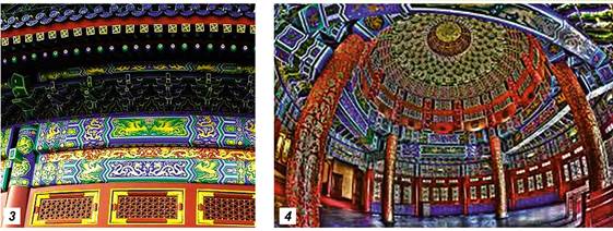Храм Неба: 1 - екстер’єр; 2 - вигляд з висоти пташиного лету; 3 - фрагмент декору; 4 - інтер’єр