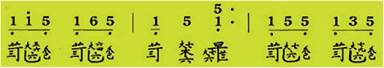 Фрагмент запису музики для циня одночасно у двох нотаціях - цифровій та ієрогліфічній, винайденій ще в часи епохи Тан (династії Лі, 618-907 рр.)